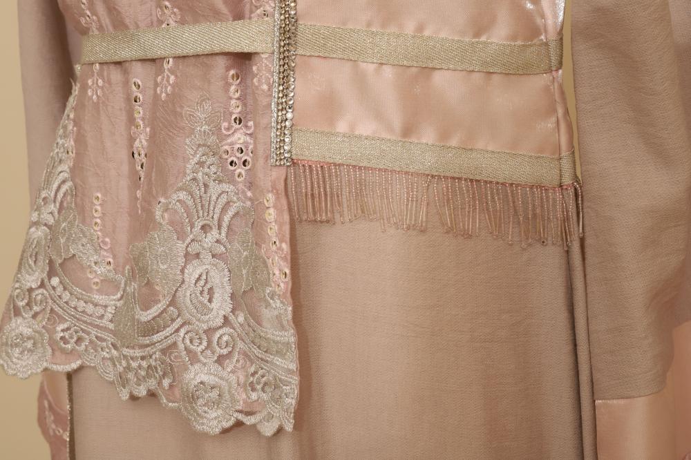 جلابية مطرزة للمناسبات ليان هي فستان كافطان فاخر باللونين البيج والوردي، مع تطريزات دقيقة من كلفة جوبير وحزام لامع يزين الخصر، لتضفي على إطلالتك لمسة من الأناقة والفخامة بفضل الأكمام الطويلة والمصممة خصيصًا لتناسب جميع المناسبات الراقية.